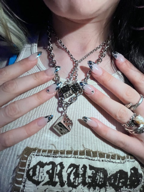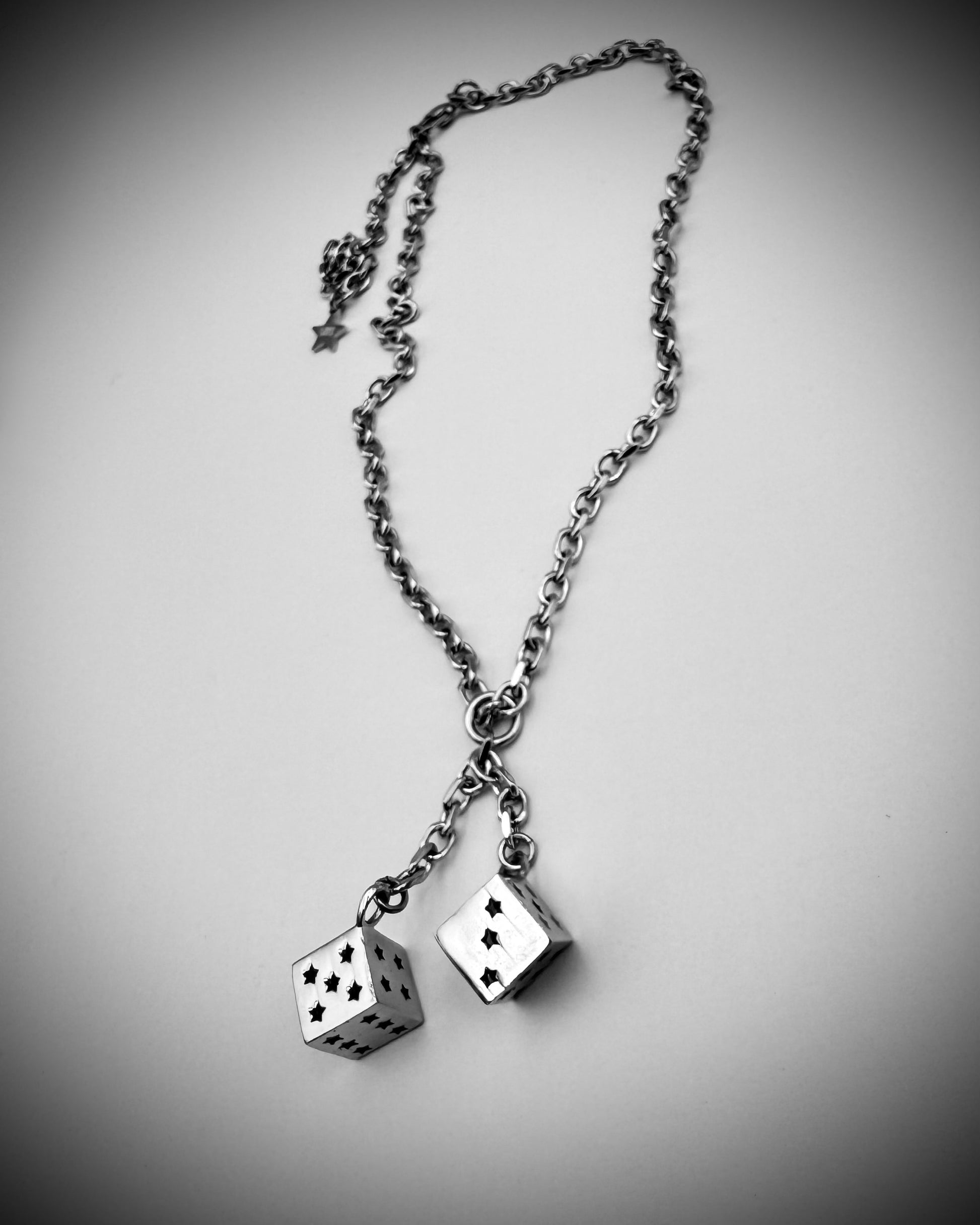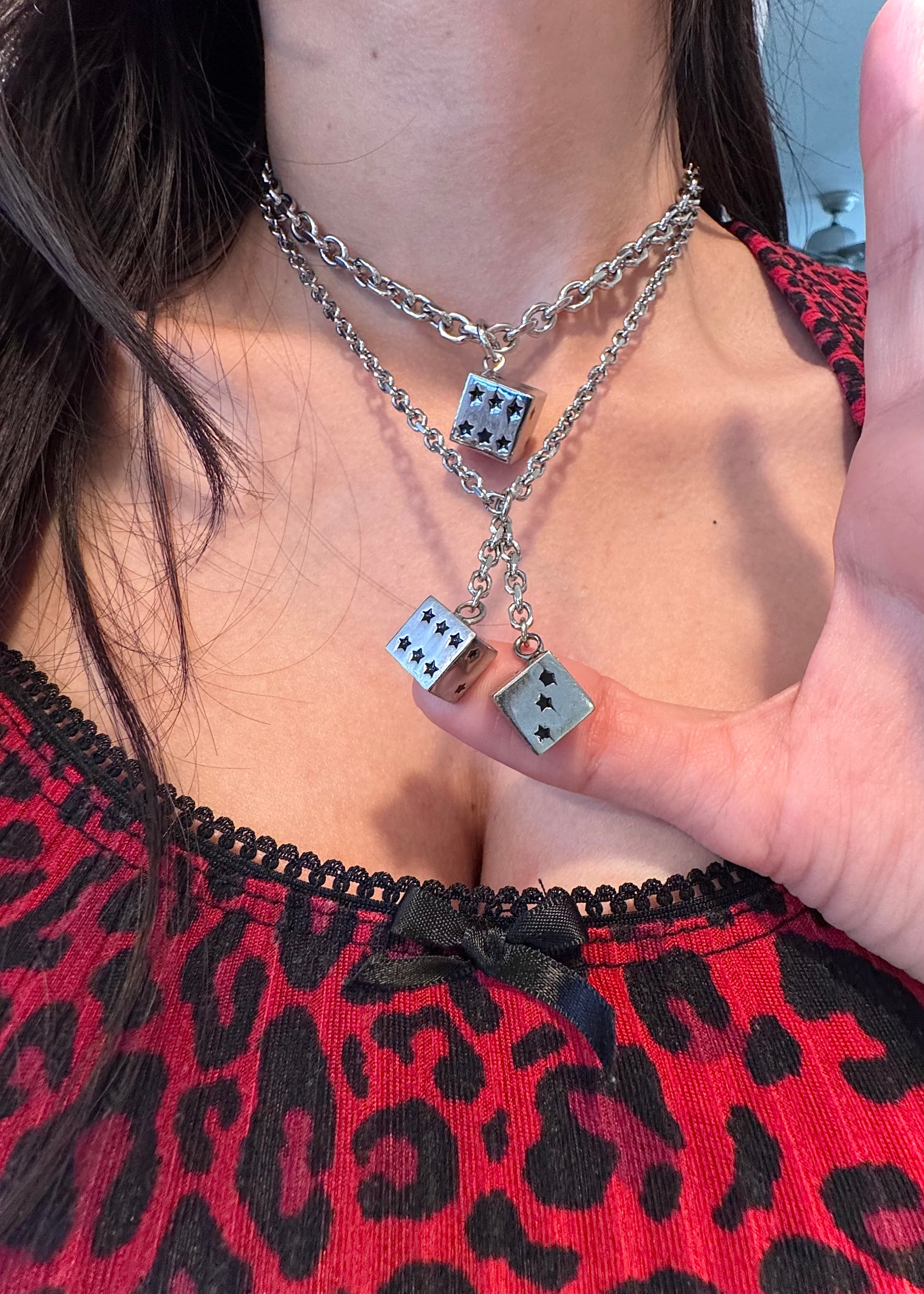 Add some cosmic luck to your fit with the Lucky Star Dice Necklace. This double dice pendant necklace features two mini hanging dice with star shaped pips instead of dots, the perfect mix of edgy and playful. Whether you’re into alt, punk, Y2K, or streetwear vibes, this star dice necklace adds bold detail to your stack.