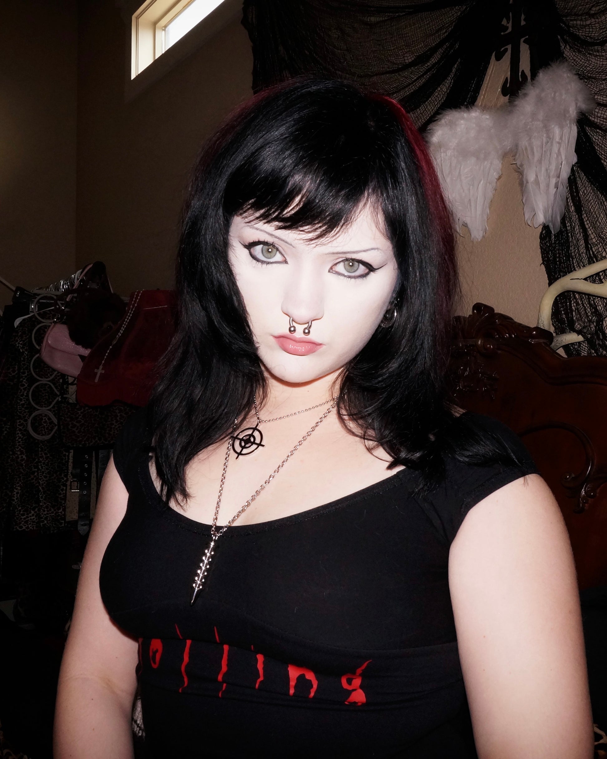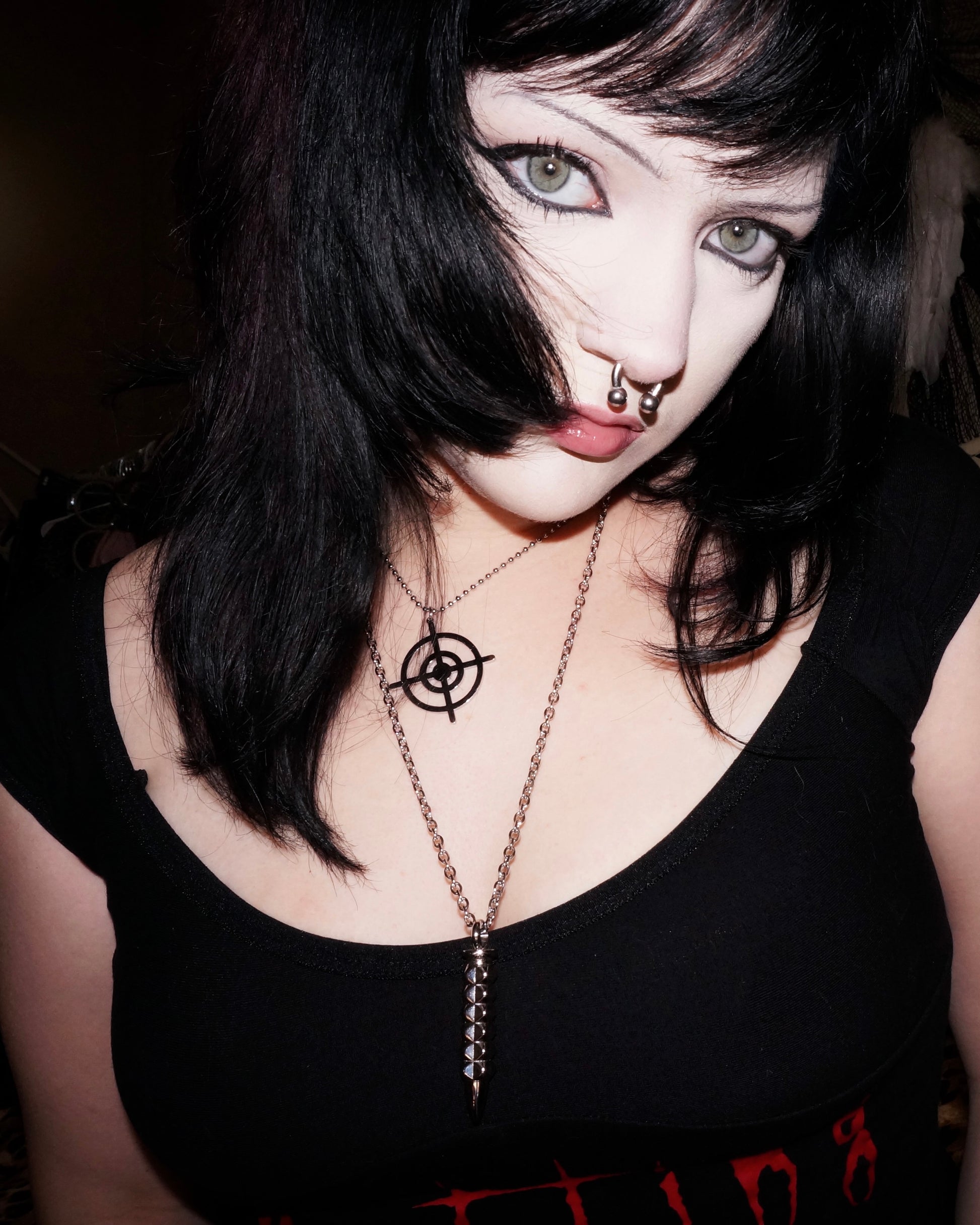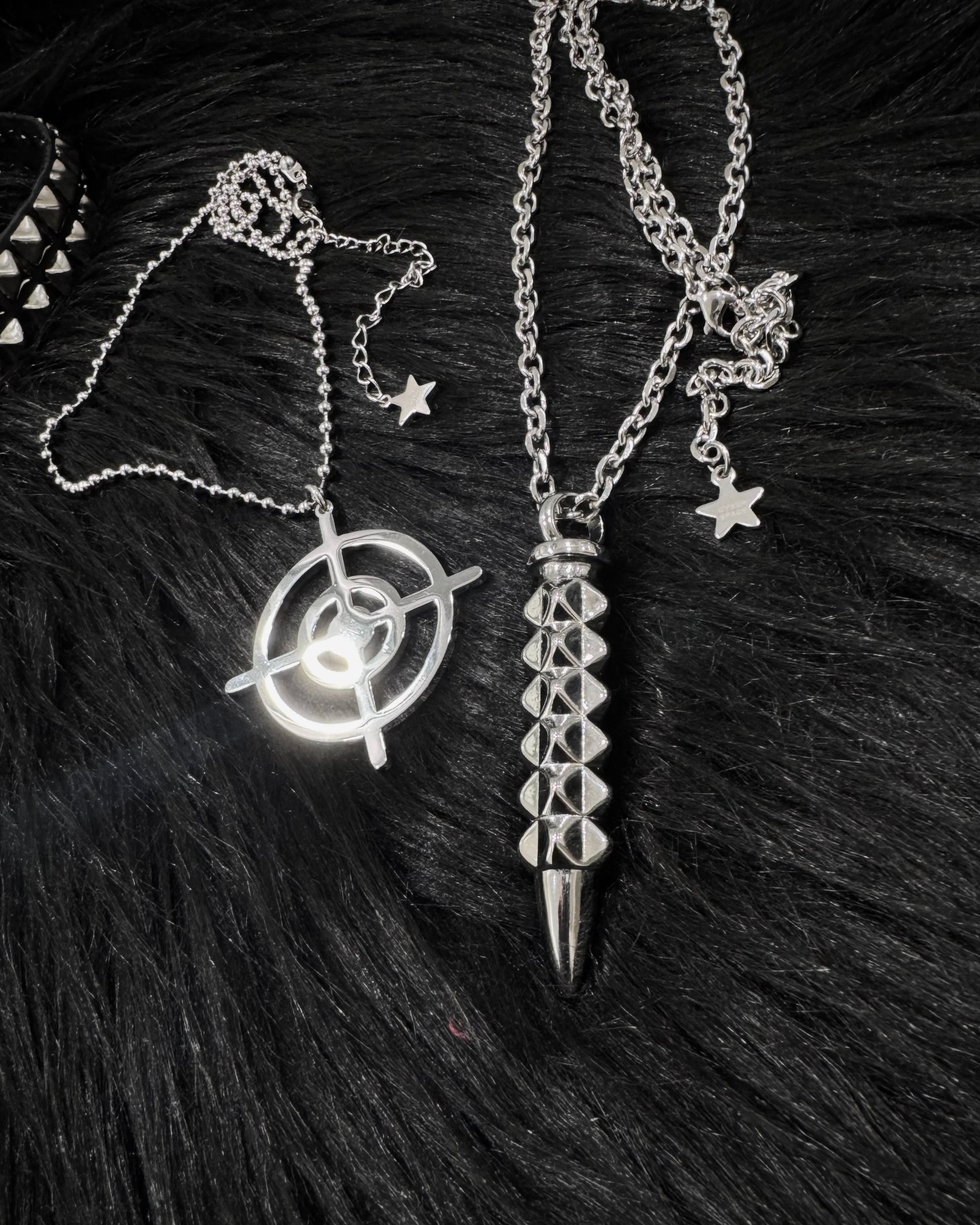 - Set includes two necklaces: studded bullet and crosshairs necklaces.